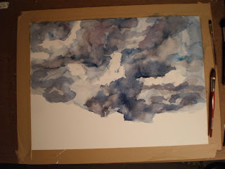 This is a watercolor on 300# Canson. You can see in the first pic that I have a few of the bright whites masked out with masking tape (gives a nice torn edge as opposed to masking fluid.) The first step after masking, which I did not get a photo of, was to lay in a fairly flat solid wash of French Ultramarine and Burnt Sienna (one of my favorite landscape neutrals.) When this field was still wet but just with a light sheen to it (nearly dry) I dropped clear water into the wash and let it bloom. This is why I love watercolor–I could watch paint bloom all day, it’s fascinating. Anyway, I lifted the paint from the middle of the blooms, then let the whole field dry, removed the mask, and started laying in layers of paint to push the values farther and define the clouds.