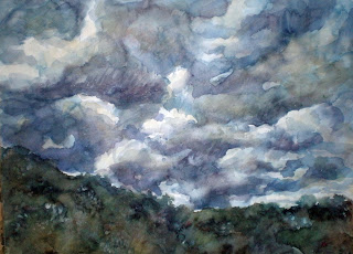 This is a watercolor on 300# Canson. You can see in the first pic that I have a few of the bright whites masked out with masking tape (gives a nice torn edge as opposed to masking fluid.) The first step after masking, which I did not get a photo of, was to lay in a fairly flat solid wash of French Ultramarine and Burnt Sienna (one of my favorite landscape neutrals.) When this field was still wet but just with a light sheen to it (nearly dry) I dropped clear water into the wash and let it bloom. This is why I love watercolor–I could watch paint bloom all day, it’s fascinating. Anyway, I lifted the paint from the middle of the blooms, then let the whole field dry, removed the mask, and started laying in layers of paint to push the values farther and define the clouds.