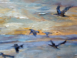 Please note: the first image here is my underpainting which, as we remember, looked like a poorly formed pterodactyl. The final image here shows you the birds in detail with a little more finesse.