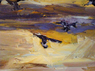 Please note: the first image here is my underpainting which, as we remember, looked like a poorly formed pterodactyl. The final image here shows you the birds in detail with a little more finesse.