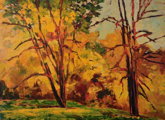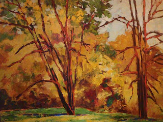 Title of this piece is “Elwha Maples.” Oil on canvas, 36×48″. The top image is the under-painting, the bottom is the finished piece.